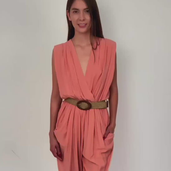 Pieza completa material en algodón es una pieza fresca y cómoda su elástico en la cintura y sus pliegues en la cadera dan una forma ceñida al cuerpo que la hace una pieza con estilo