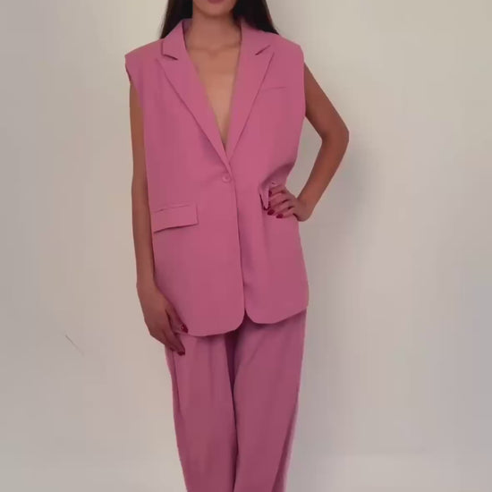 Conjunto de blazer y pantalon en color rosado el blazer es sin manga y bastante amplia la manga la tela es de algodón suelto su tela lo hace un conjunto versátil y cómodo