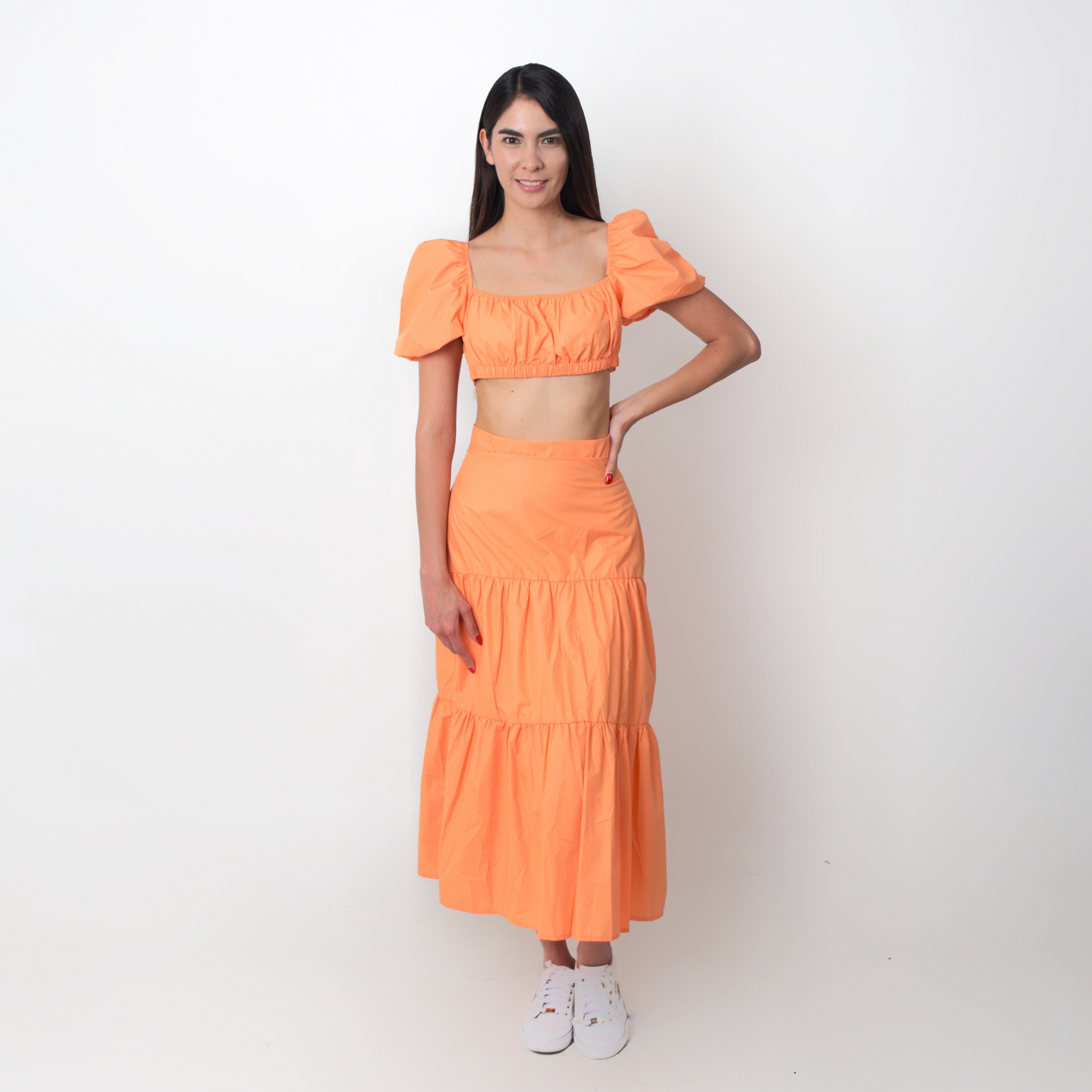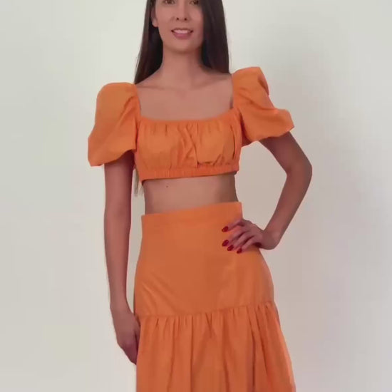 Conjunto de falda color naranja en tela de algodón el crop top tiene dos funciones le puedes hacer el nudo en frente y en la parte de atrás dando dos estilos totalmente diferente su textura hace de las piezas una forma muy elegante y chic