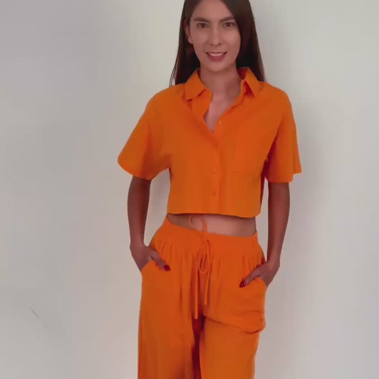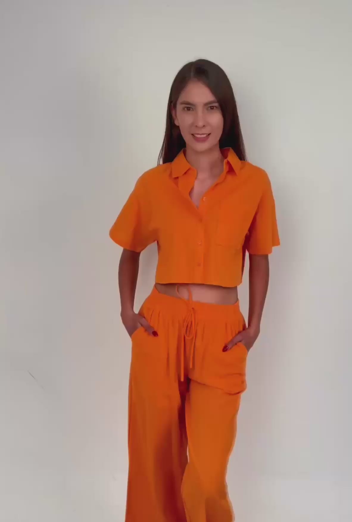 Conjunto de pantalon color naranja en tela de lino material fresco y elegante