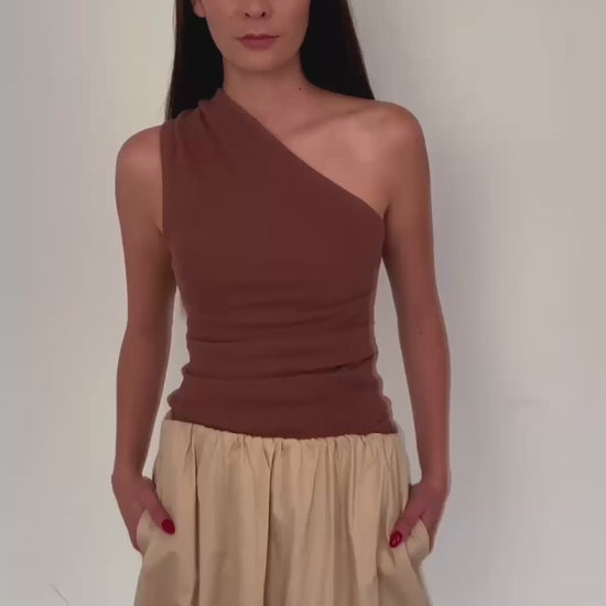 Blusa estilo de un solo hombro ideal como top básico en color marrón